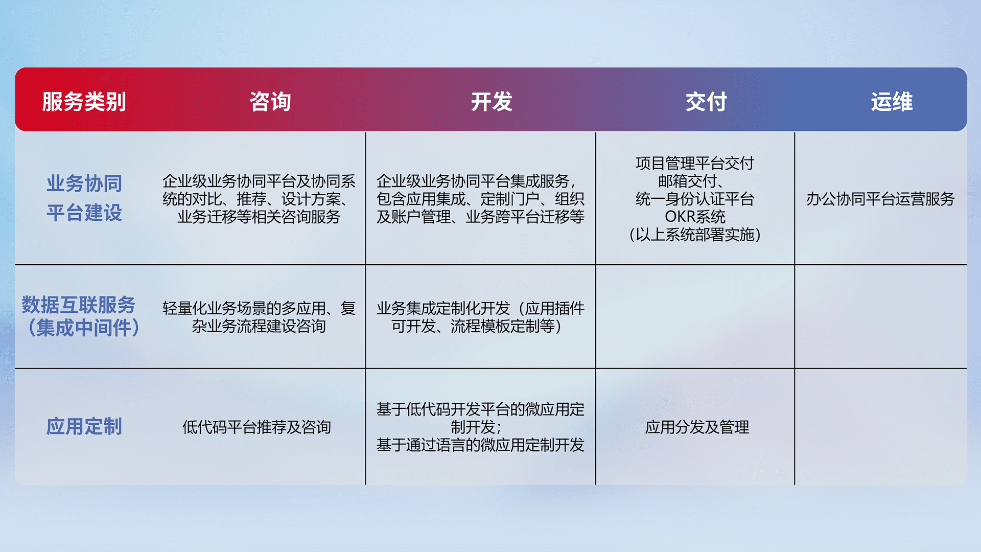 针对钉钉、、企微、、、IDaas等平台级产品提供产品的规划、、、、方案、、交付、、定制化开发等服务,,实现如统一协同办公、、、智能客户服务、、混合会议管理、、、智能数据查询、、、等业务场景,,,实现数字化转型。。